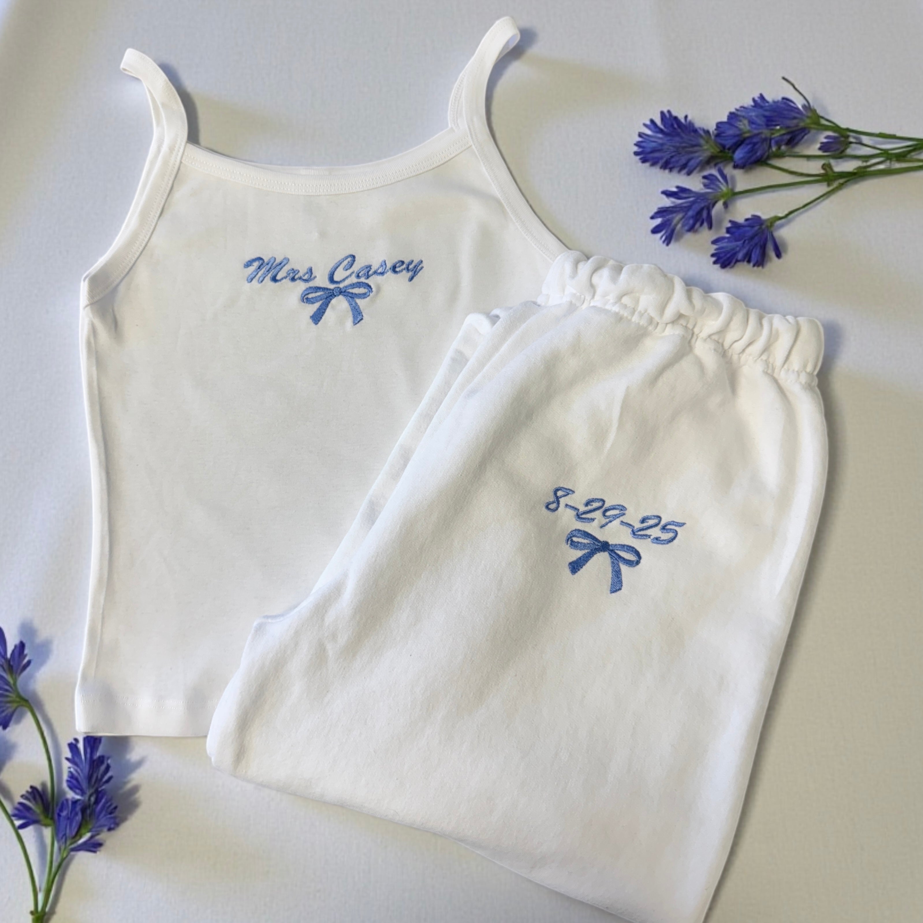 Step into your bridal era feeling confident, comfy, and effortlessly cute. This matching “Mrs.” tank top and sweatpants set is made for brides who want cozy luxury with a feminine, coquette twist. Designed with a soft, breathable tank and perfectly relaxed sweatpants, this set is ideal for getting ready on your wedding day, bachelorette weekends, bridal showers, or honeymoon travel outfits.