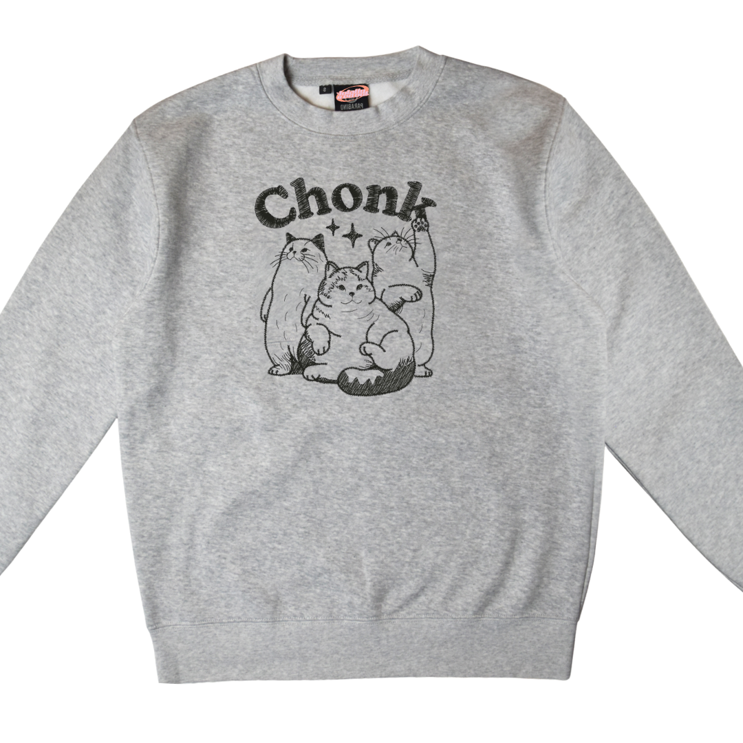 - Features detailed embroidery of a cute cats with the witty phrase "Chonk" referring to the fat cats we love