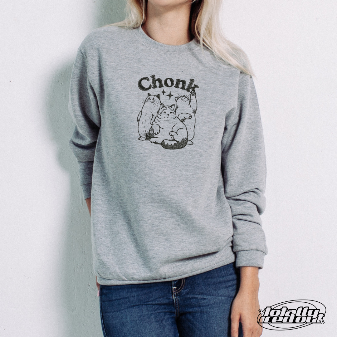 For cat moms and cat lover sweater enthusiasts alike, this cozy embroidered sweatshirt or tee captures the playful spirit of feline companionship with a cheeky twist. Featuring a charming cute cat design, our CHONK sweatshirt or tee blends comfort and humor for those who proudly share inside jokes with their furry friends. Whether you're searching for a gift for cat lover friends or treating yourself, this versatile piece promises warmth and style all season long.