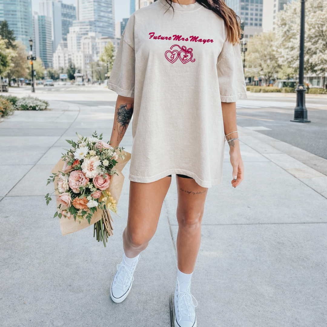 Our Future Mrs. embroidered Comfort Colors® tee features an elegant stitched design that reads “Future Mrs. ____” paired with a vintage-inspired embroidered locket, personalized just for you with your chosen initials inside.
