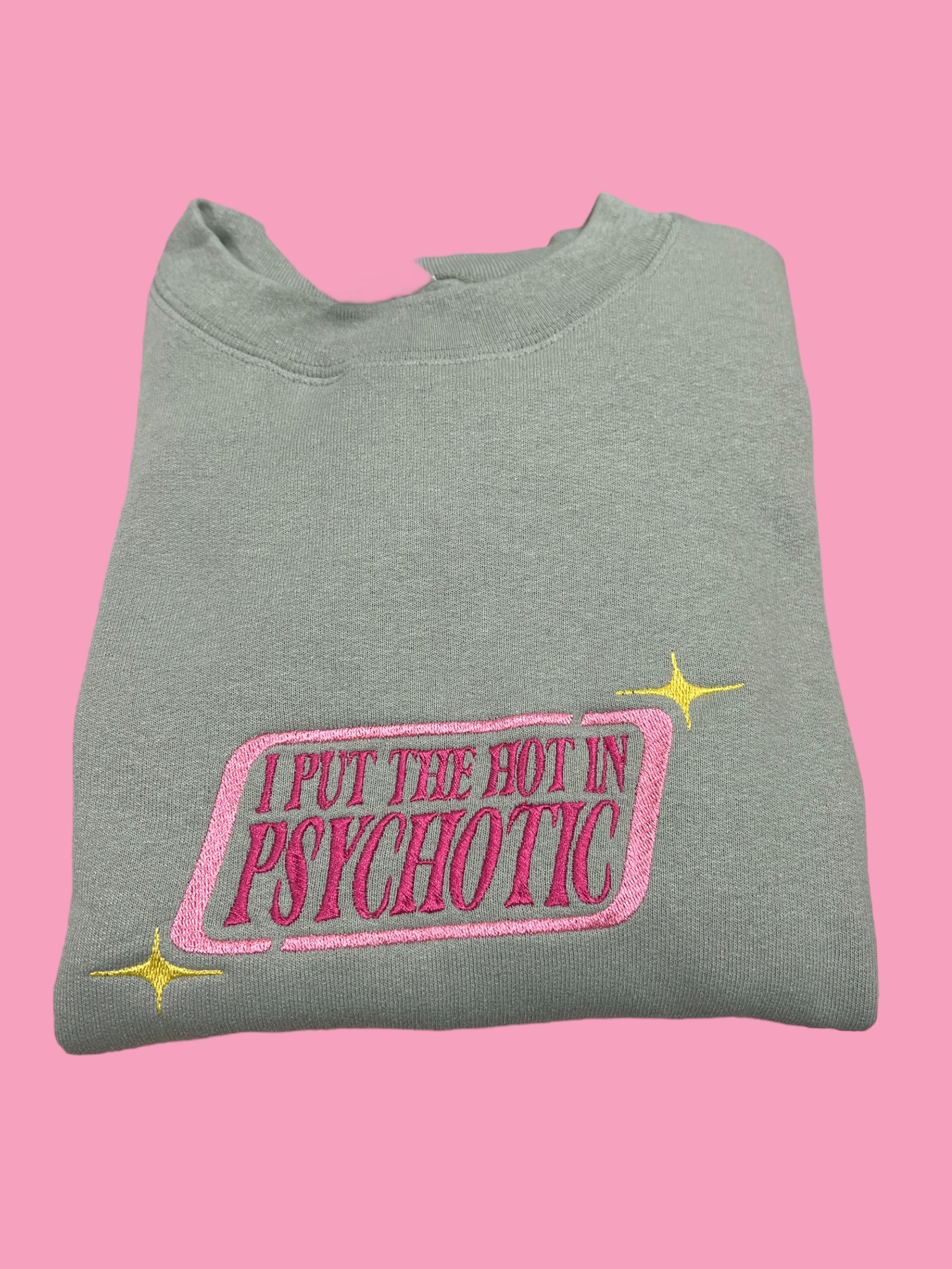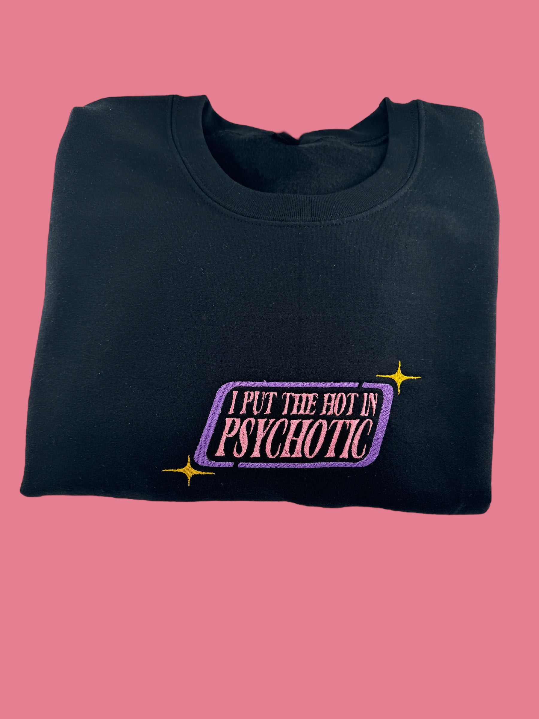 Featuring a sparkling, Y2k-inspired design, this sweatshirt is perfect for any fashion-forward individual. The embroidered I Put The Hot In Psychotic adds a unique and eye-catching touch to this crewneck, making it a standout piece in your wardrobe.