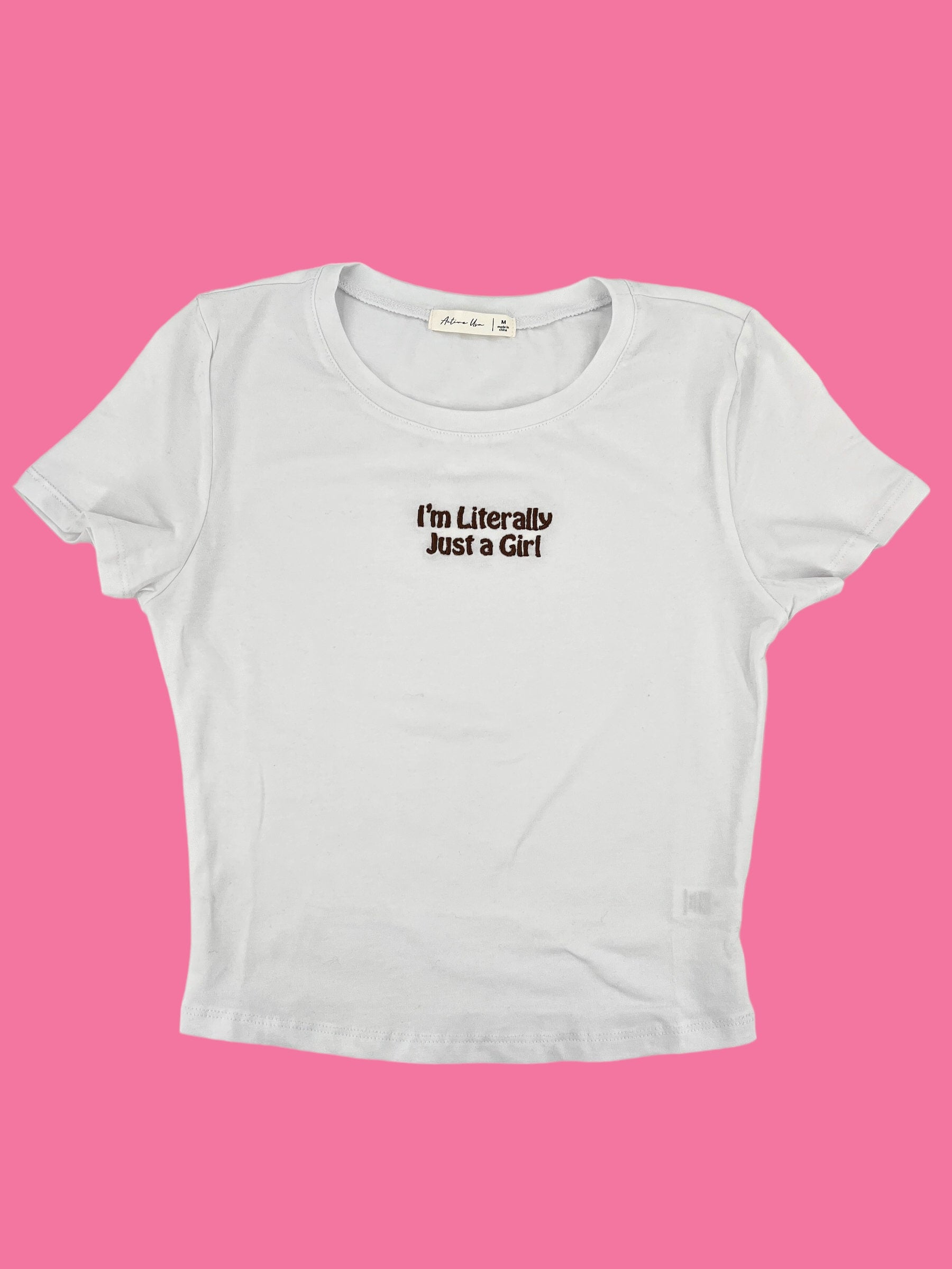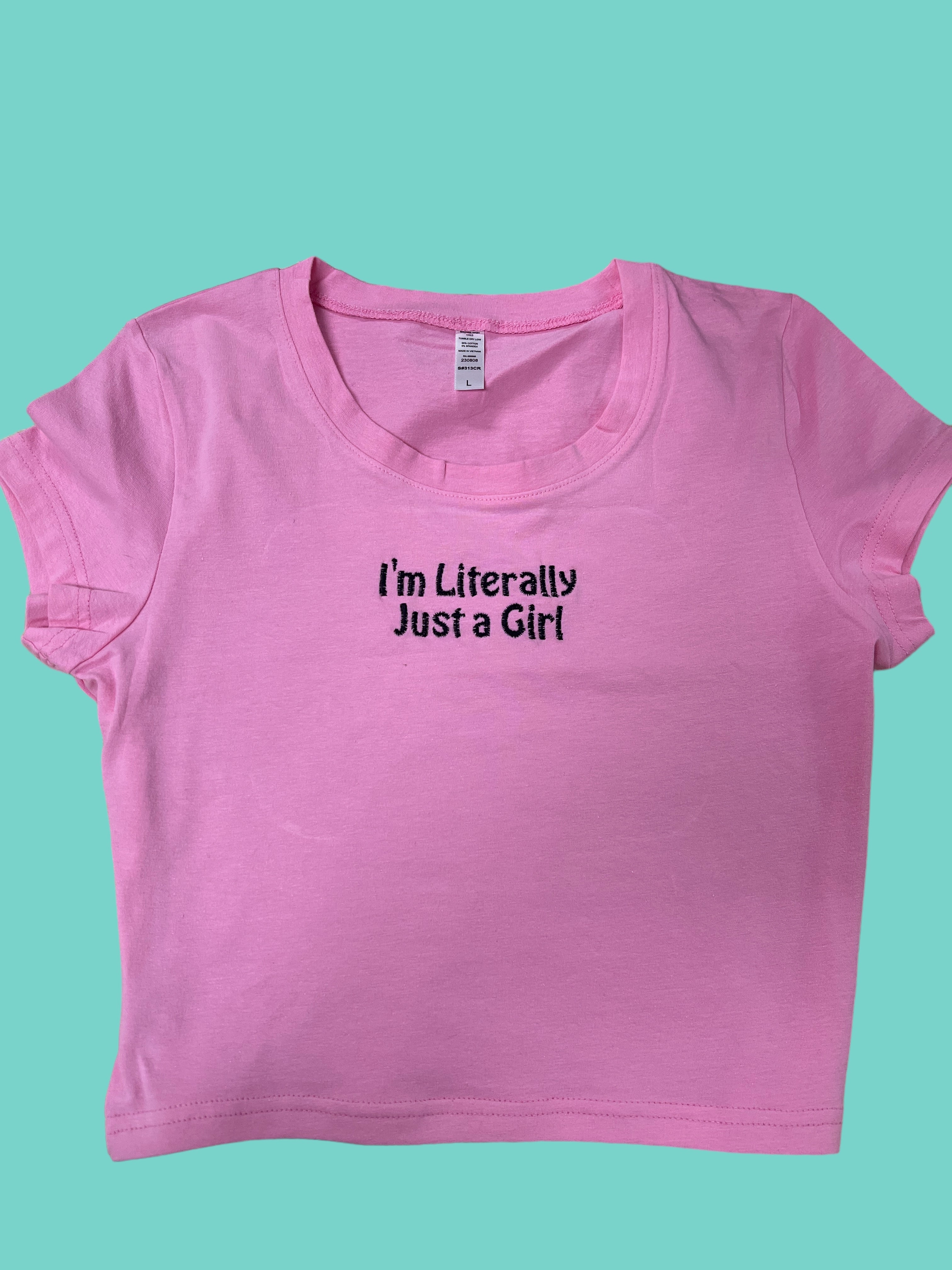 Are you like literally just a girl? I'm literally just a girl baby tee is embroidered on a 95% cotton/5%...