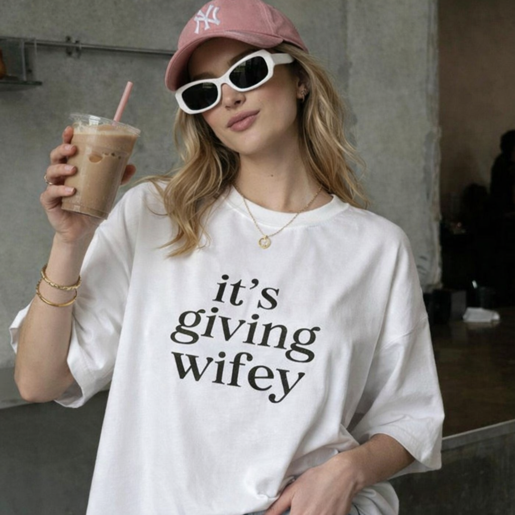 If the vibe is confident, engaged, and absolutely in her wifey era, this “It’s Giving Wifey” t-shirt is the ultimate statement piece. Featuring bold, oversized lettering, this tee is designed to turn heads whether you’re headed to a bachelorette party, bridal shower, honeymoon airport fit, or just living your best engaged life.