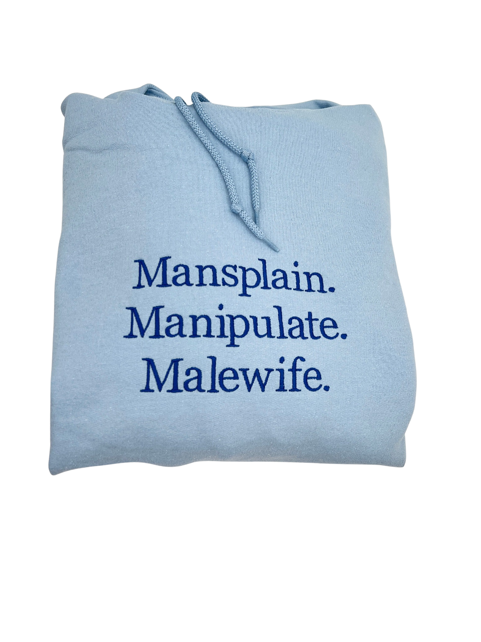 So you have the Gaslight, Gatekeep, Girlboss shirt and you need one for your man? We've got you covered. Mansplain, Manipulate, Alewife shirt available in 100% ringspun cotton tee or 50/50 cotton/poly blend crewneck sweatshirt or hoodie-choose from so many colors!