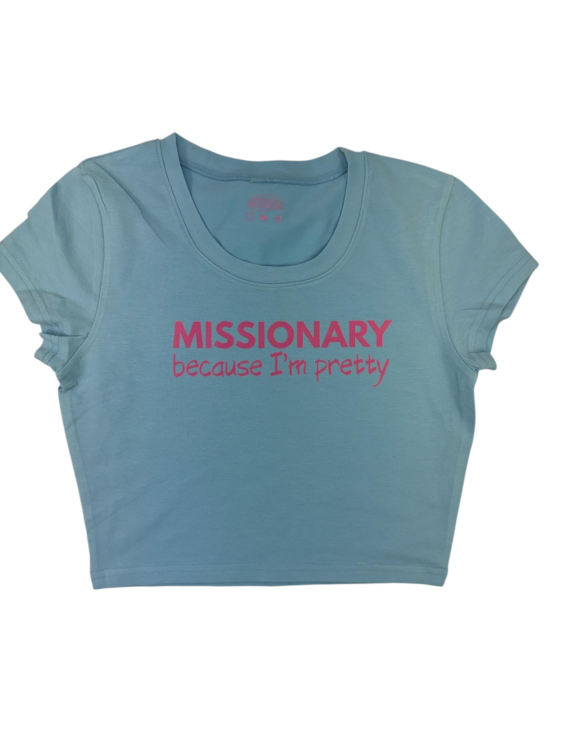 Missionary because I am pretty is printed on a 95% cotton/5% spandex crop top for a form-fitting fit. Available in...