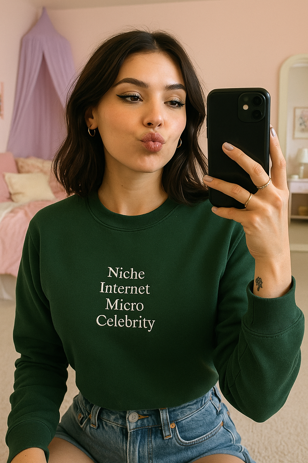 Crafted with soft, high-quality fabric, our tee or crewneck is both comfortable and stylish. The "Micro Niche Internet Celebrity" message lets you proudly showcase your online persona, embracing the quirks and passions that make you stand out.