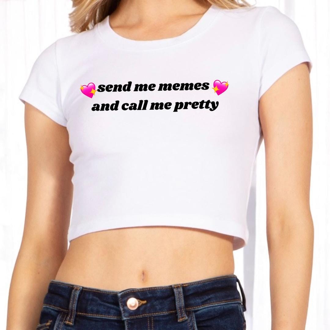 Send Me Memes And Call Me Pretty is printed on a 95% cotton/5% spandex crop top or cropped high neck...