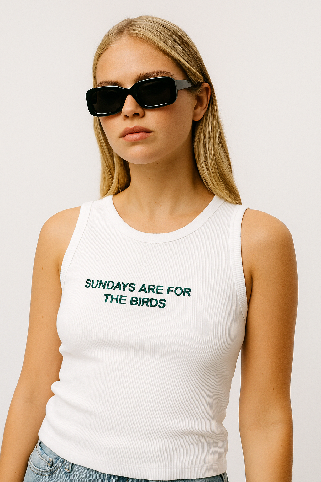 Game day just got a whole lot cuter with our ribbed white tank top embroidered with “Sundays Are For The Birds”. Perfect for showing your Philadelphia pride, this fitted tank is soft, stretchy, and made for cheering on the team in comfort and style. Whether you’re tailgating, watching from the couch, or hitting the stadium, this embroidered tank is the ultimate game day outfit essential.