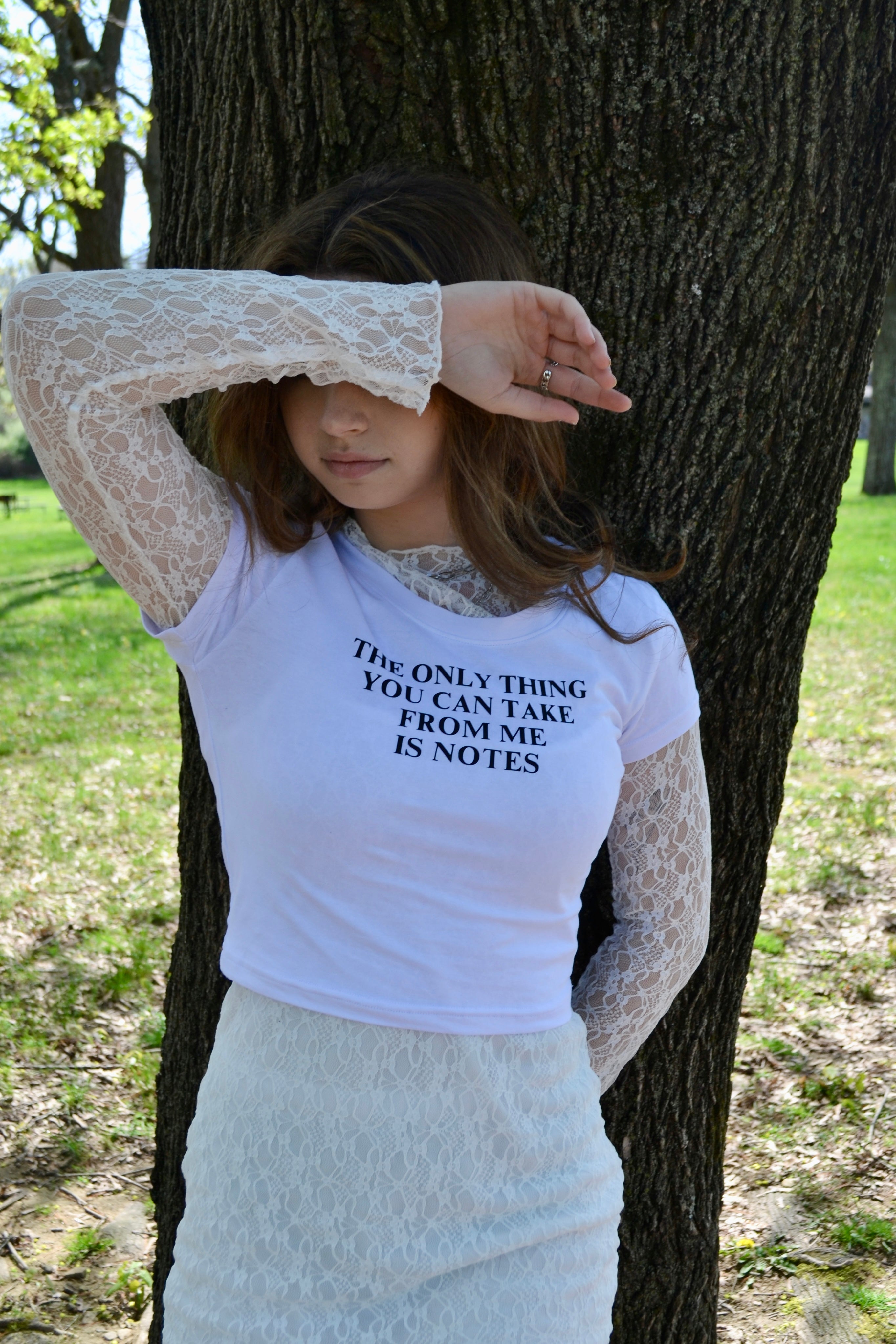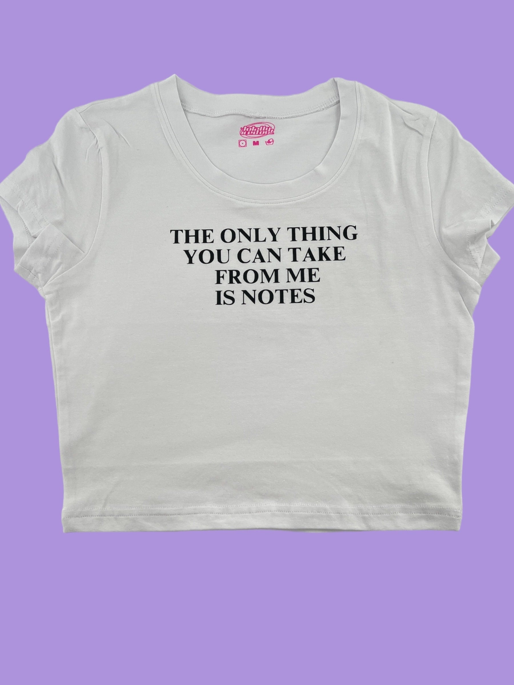 The Only Thing You Can Take From Me Is Notes crop tee is printed on a 95% cotton/5% spandex crop...