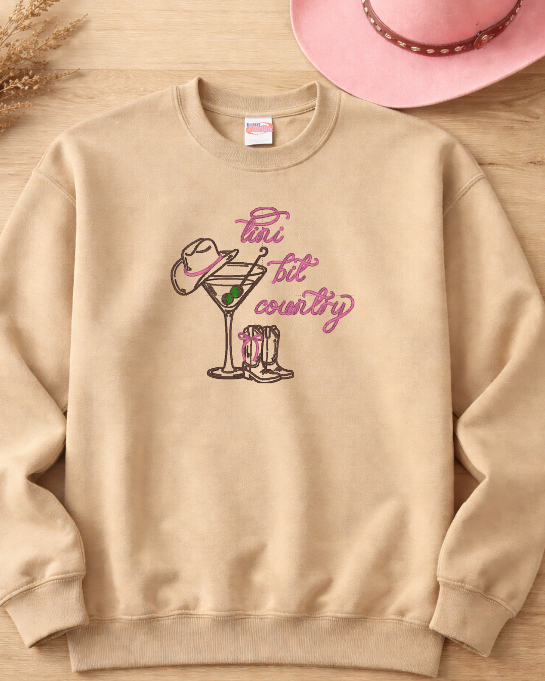 The “A Tini Bit Country” tee or sweatshirt is made for girls who love martinis and country music, cowboy boots and bows, honky-tonks and happy hour.