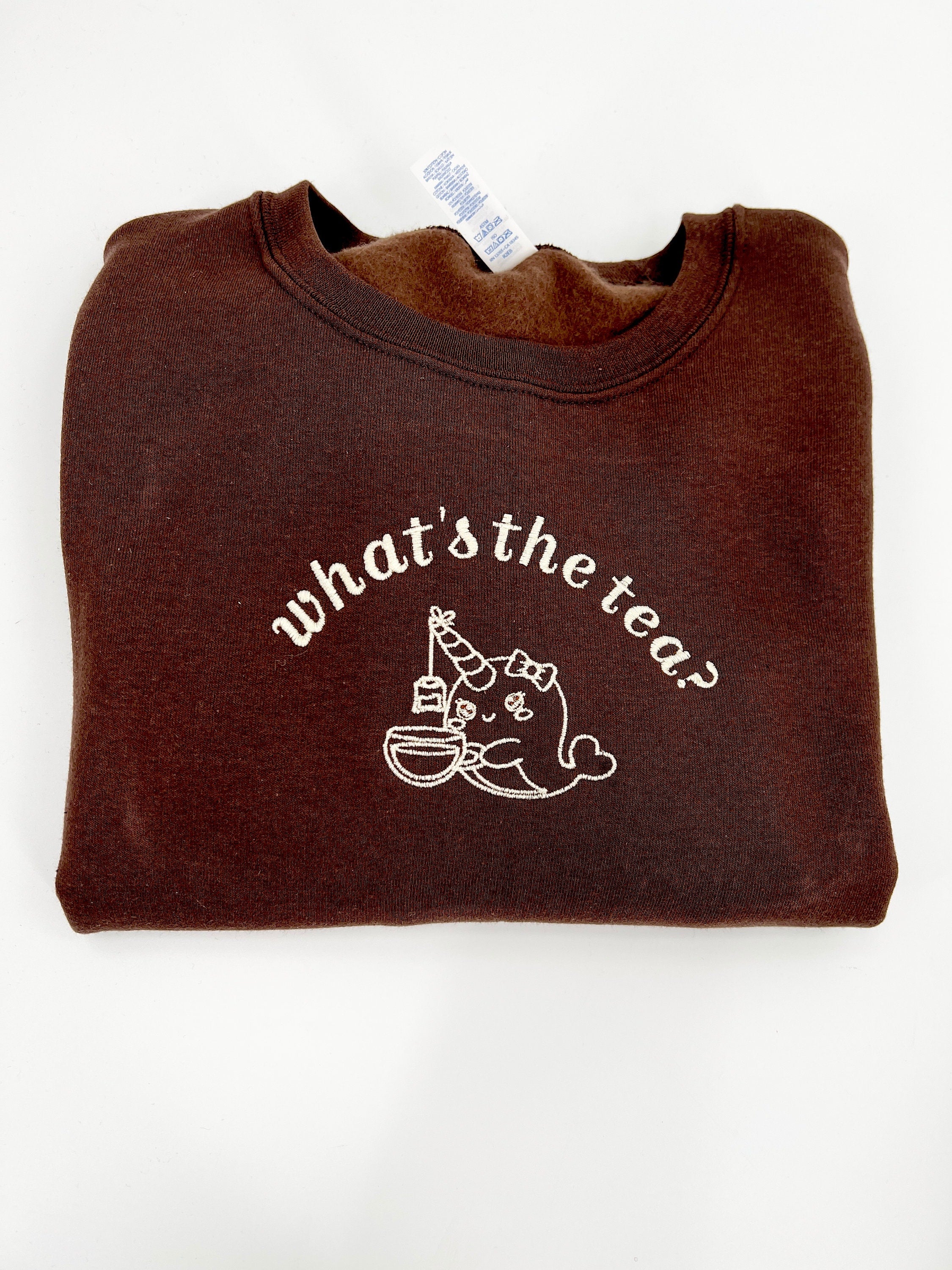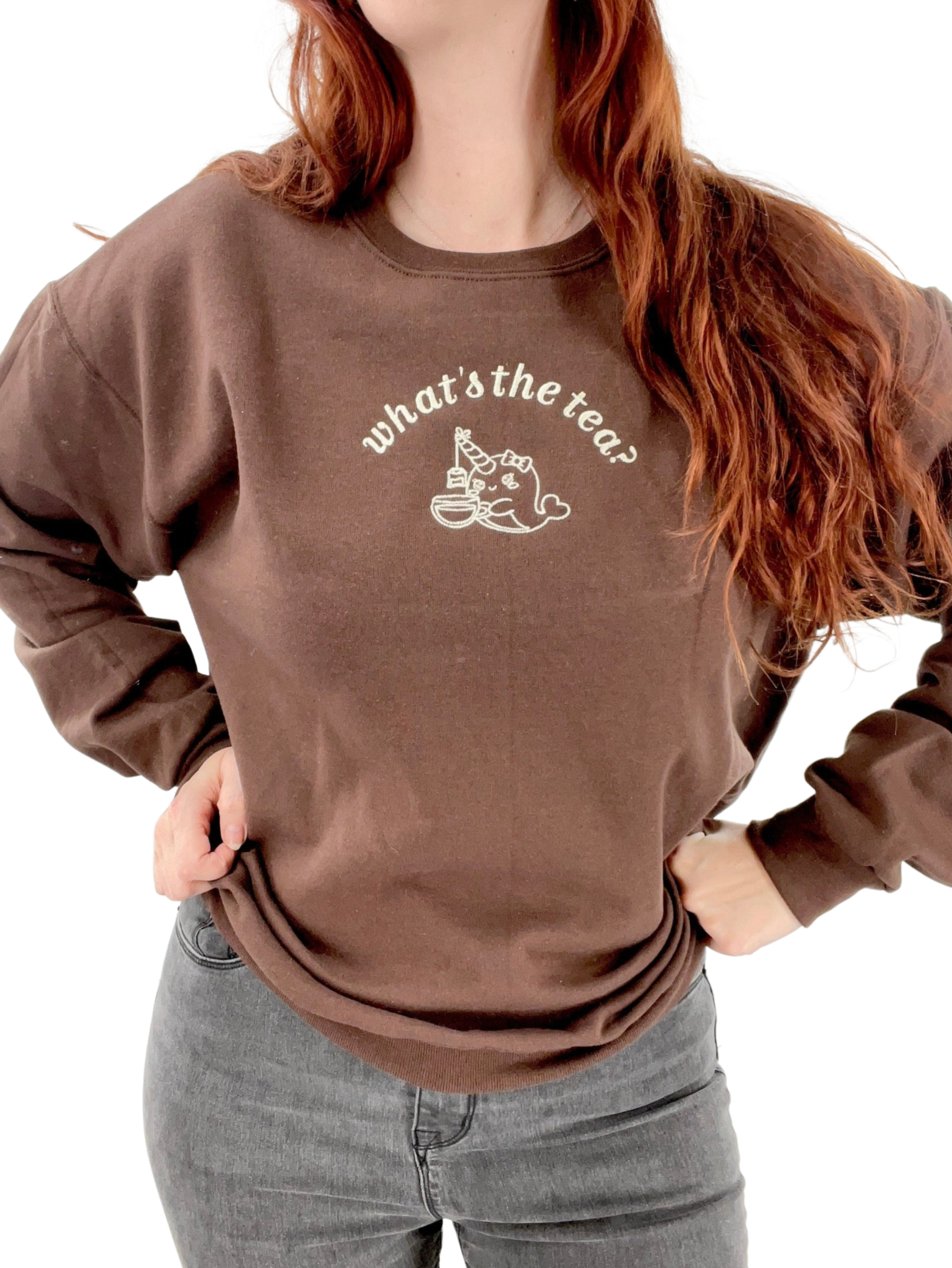 You know you want to hear it. What's the tea? is embroidered on 100% cotton tee or 50/50 cotton/poly blend crewneck sweatshirt-choose from so many colors!
