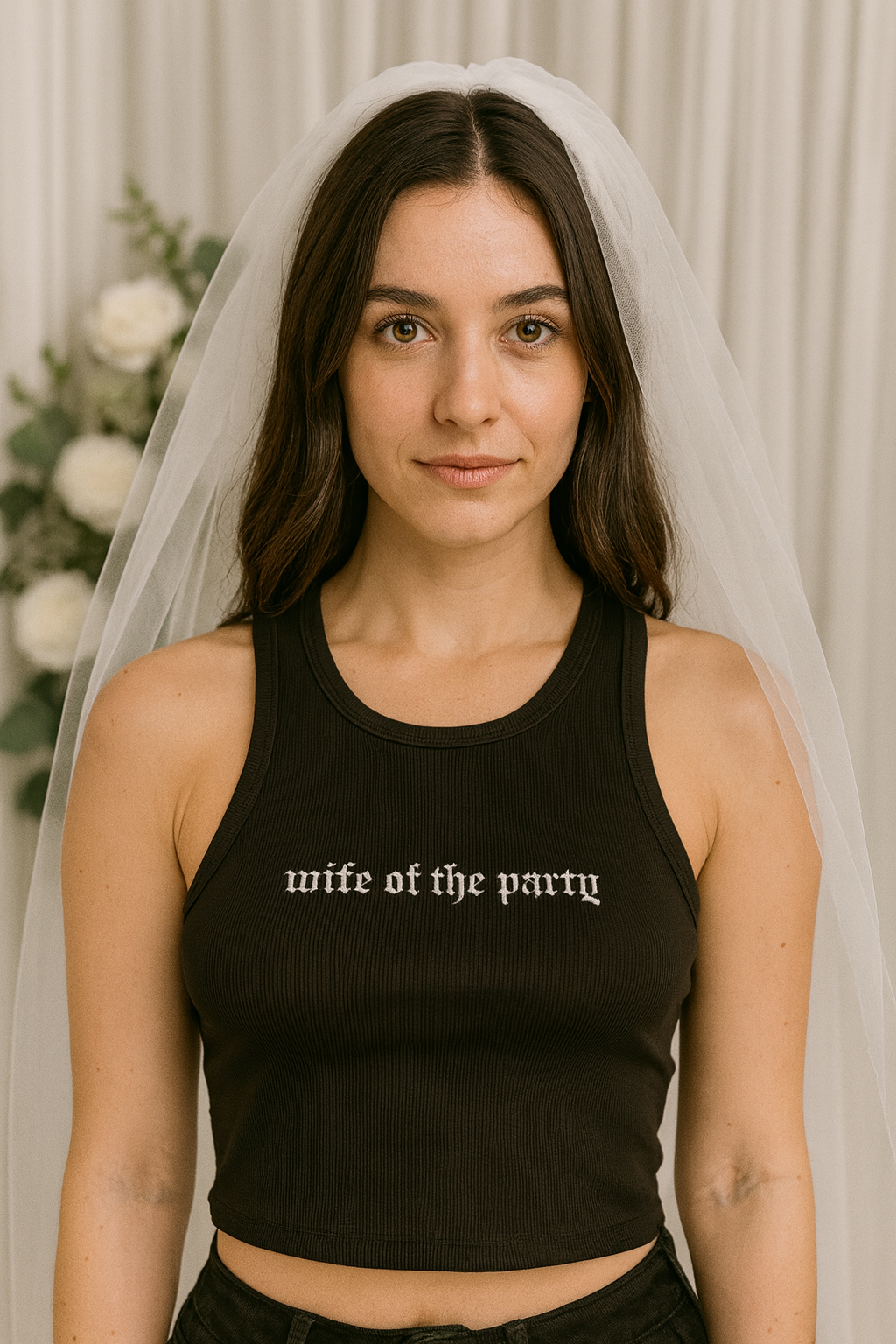 Be the ultimate statement-maker in our “Wife of the Party” baby tee or tank top. Designed in a flattering cropped fit with bold gothic-inspired lettering, this top is perfect for brides, bachelorettes, and anyone ready to slay the celebration in style. Whether you’re heading to a bachelorette party, bridal shower, wedding weekend, or just want to channel main-character energy, this shirt brings the perfect mix of edgy and bridal vibes.